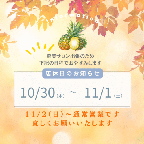 明日より奄美サロン出張につき下記日程で店休日となりますので