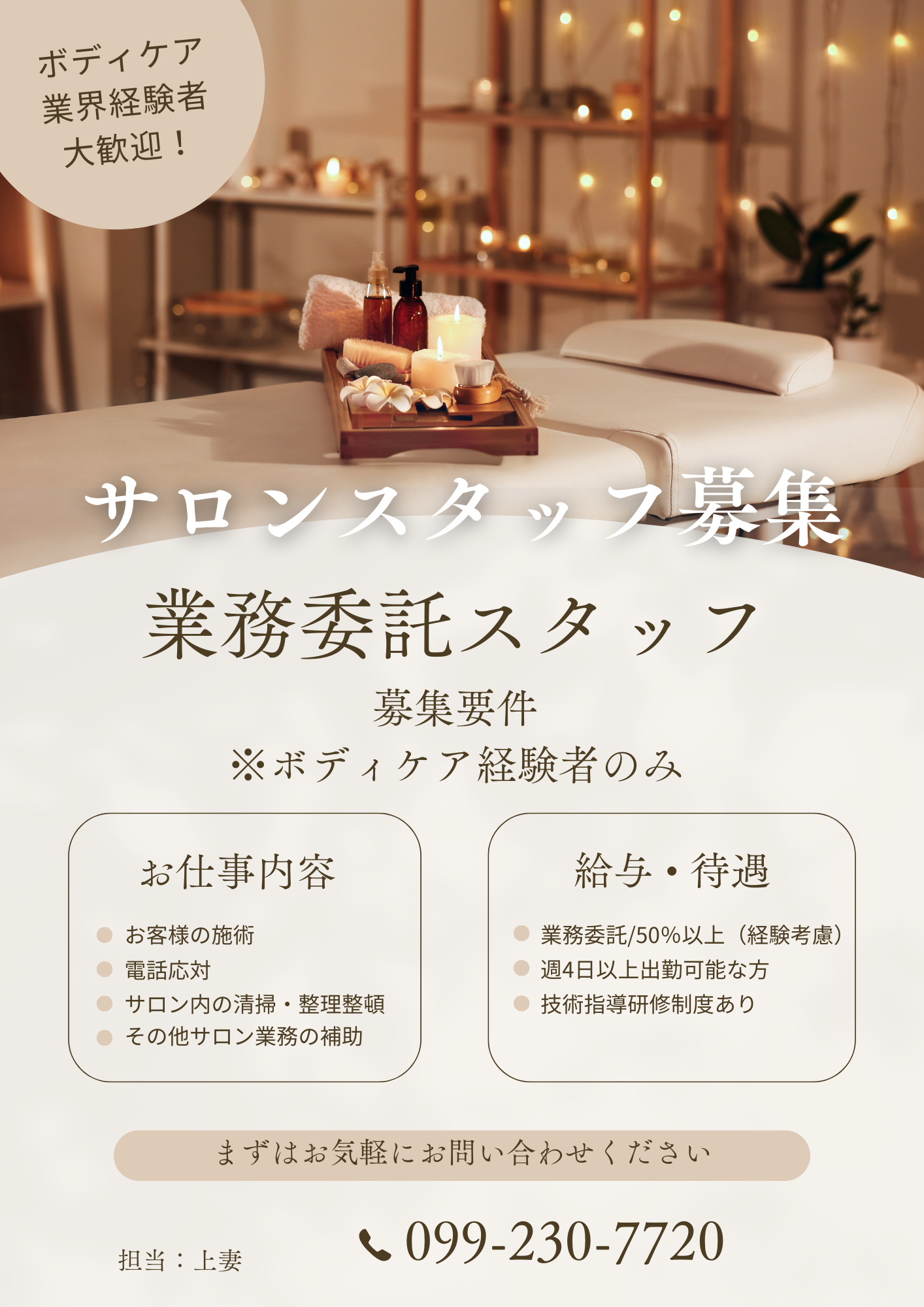 | ★現在募集中の条件はこちらです★ | ・【フルタイム勤務(正社員登用予定)】 タイ古式・もみほぐし・オイル・ドライヘッドスパ等、何らかのボディケア業務の経験が約1年以上ある方 ボディケア経験があればタイ古式自体は未経験でも可 |